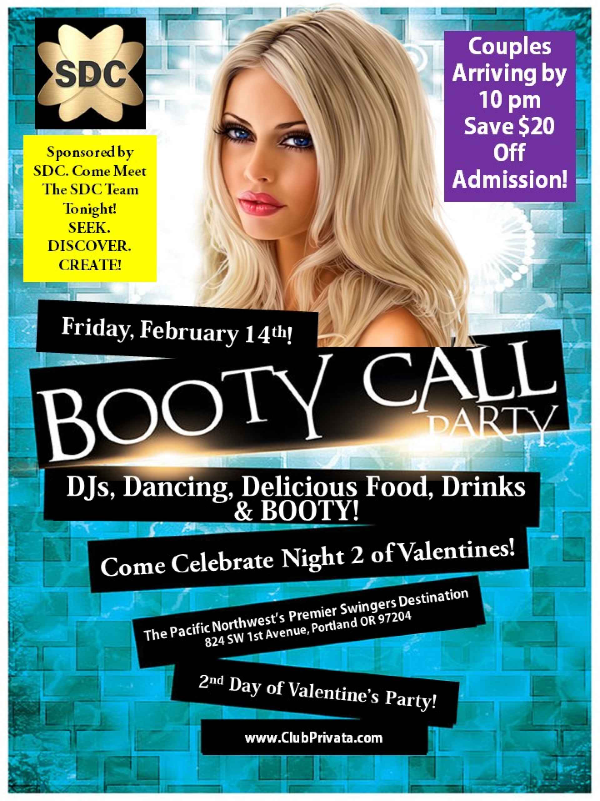 Friday Booty Call! Valentine’s heats up with our Booty Call party on Valentine’s Day. Forget the flowers as we get down to the BOOTY! All female guests will receive Privata Booty Shorts and our fabulous Kissing Booth will be open. Kick-Off Valentine’s Weekend with DJs, Dancing, cocktails and amazing prizes at Club Privata! Save money and party even more with our Weekend Party Packages. See website for details. Couples arriving by 10 pm save $20 off admission! Every Second Friday is sponsored by SDC This party is sponsored by SDC Adult Site. Meet their representatives. Seek. Discover. Create!